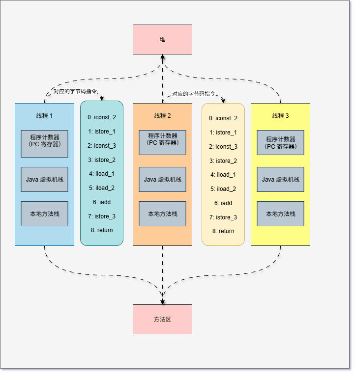 - 程序计数器(Program Counter Register,PC 寄存器):每个线程都有单独的 PC 寄存器。