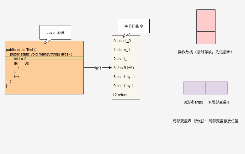 | 3️⃣ 作用于栈帧(局部变量表 + 操作数栈) | 大部分字节码不是直接操作寄存器/内存,而是依赖局部变量表和 操作数栈。例如: iload_1 → 从局部变量表 slot 1 取值 → 压入操作数栈 |