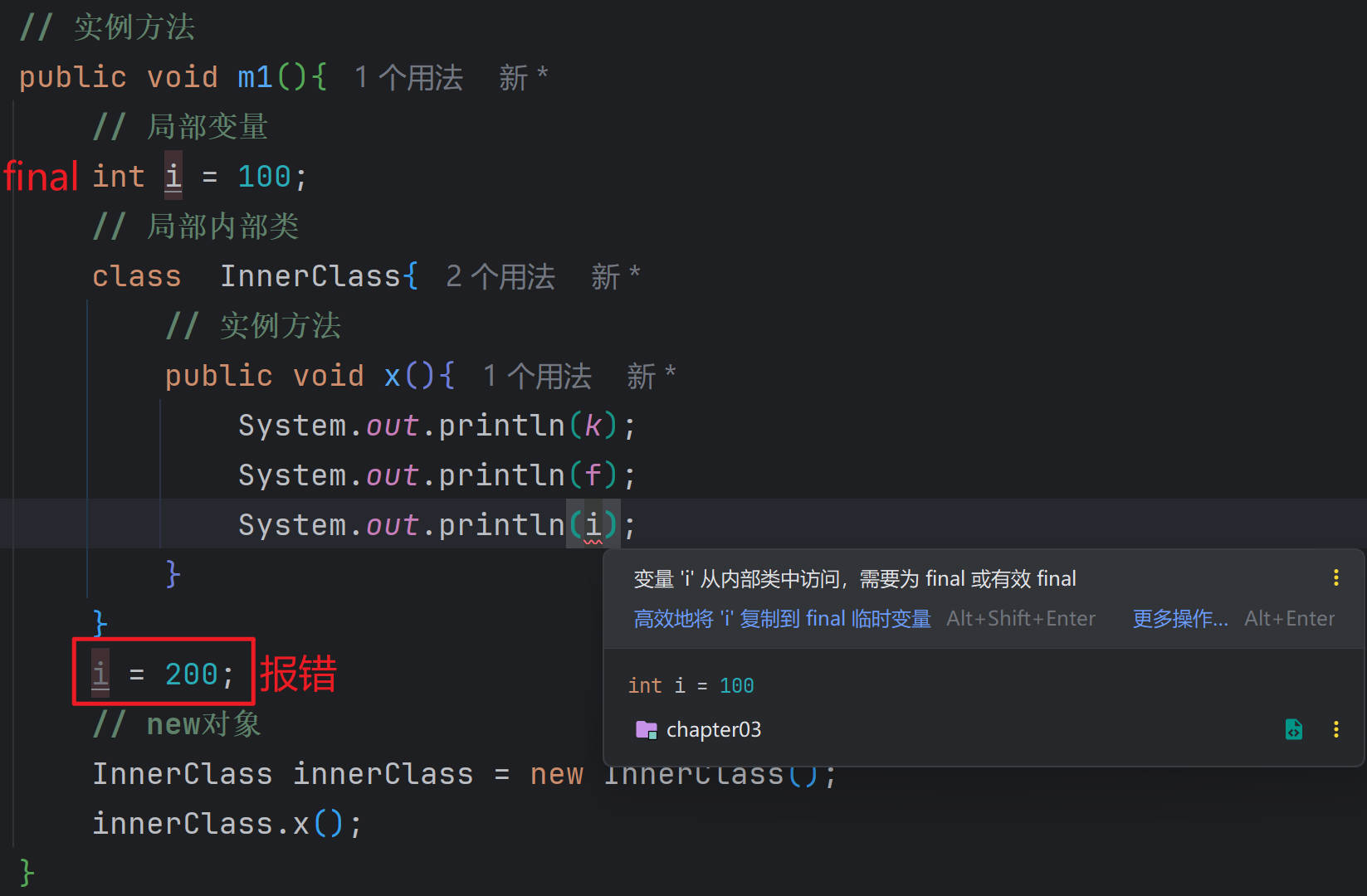 public class Student { String name = "金莲"; class Heart{ String name = "大郎"; public void display(String name){ System.out.println(name);//内部类的局部变量 System.out.println(this.name);//内部类的成员变量 System.out.println(Student.this.name);//外部类的成员变量 } } } public class Test02 { public static void main(String[] args) { Student.Heart heart = new Student().new Heart(); heart.display("涛哥"); } }