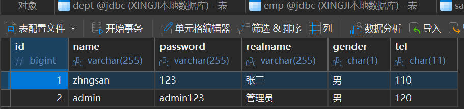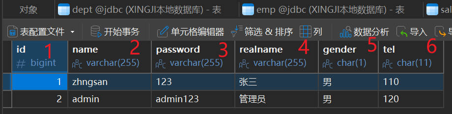 select realname,id,name,password from t_user;要查询的数据如下图: