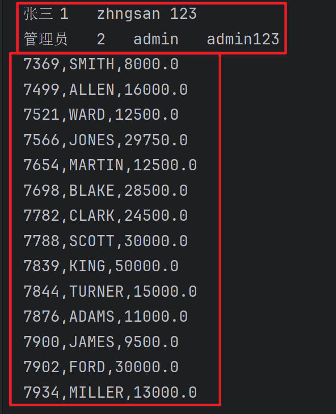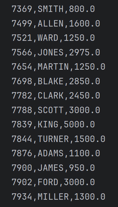 System.out.println(empno + "," + ename + "," + sal);