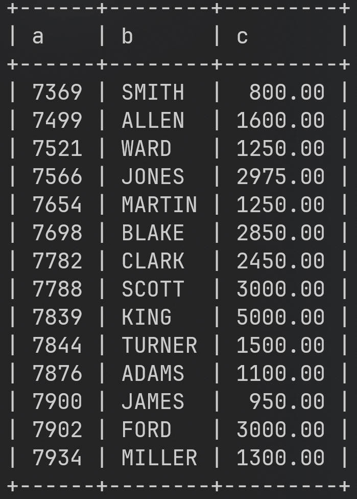 String sql3 = "select empno a,ename b,sal c from emp";