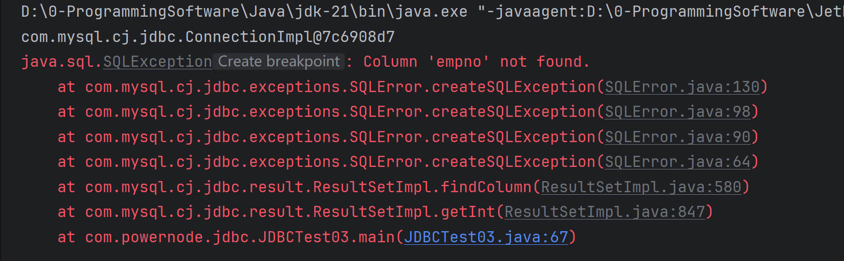 如果将上面代码中rs.getString("a")修改为rs.getString("empno"),执行就会出现以下错误: