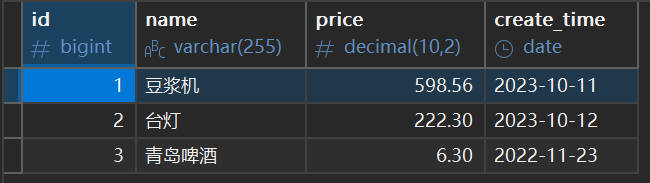id以long类型获取,name以String类型获取,price以double类型获取,create_time以java.sql.Date类型获取,代码如下: