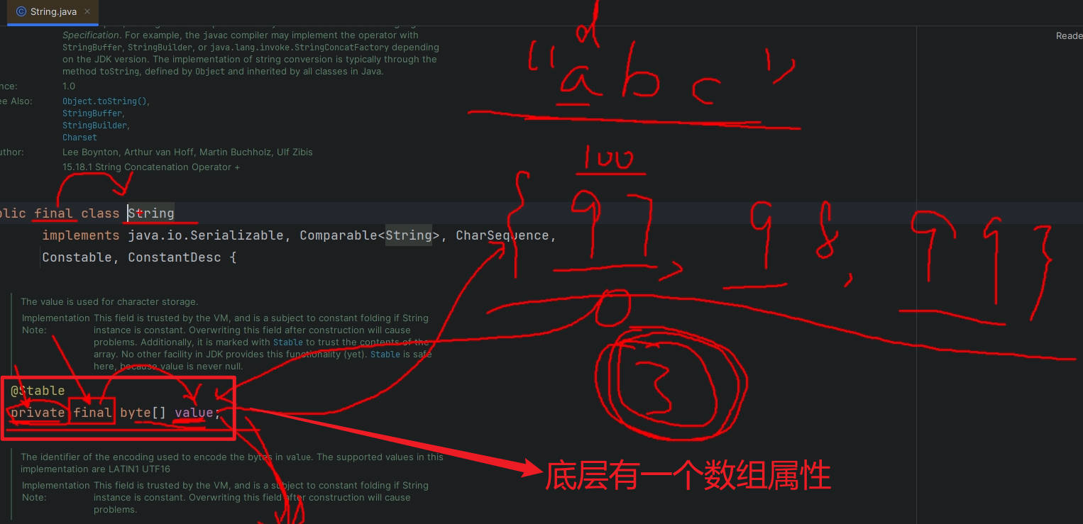 ④字符串一旦创建是不可变的。(底层String源码中有一个属性:private final byte[] value;)