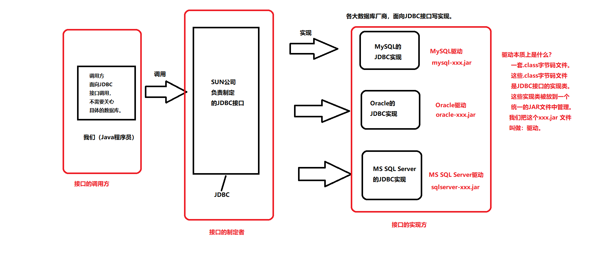 // SUN公司负责制定JDBC接口