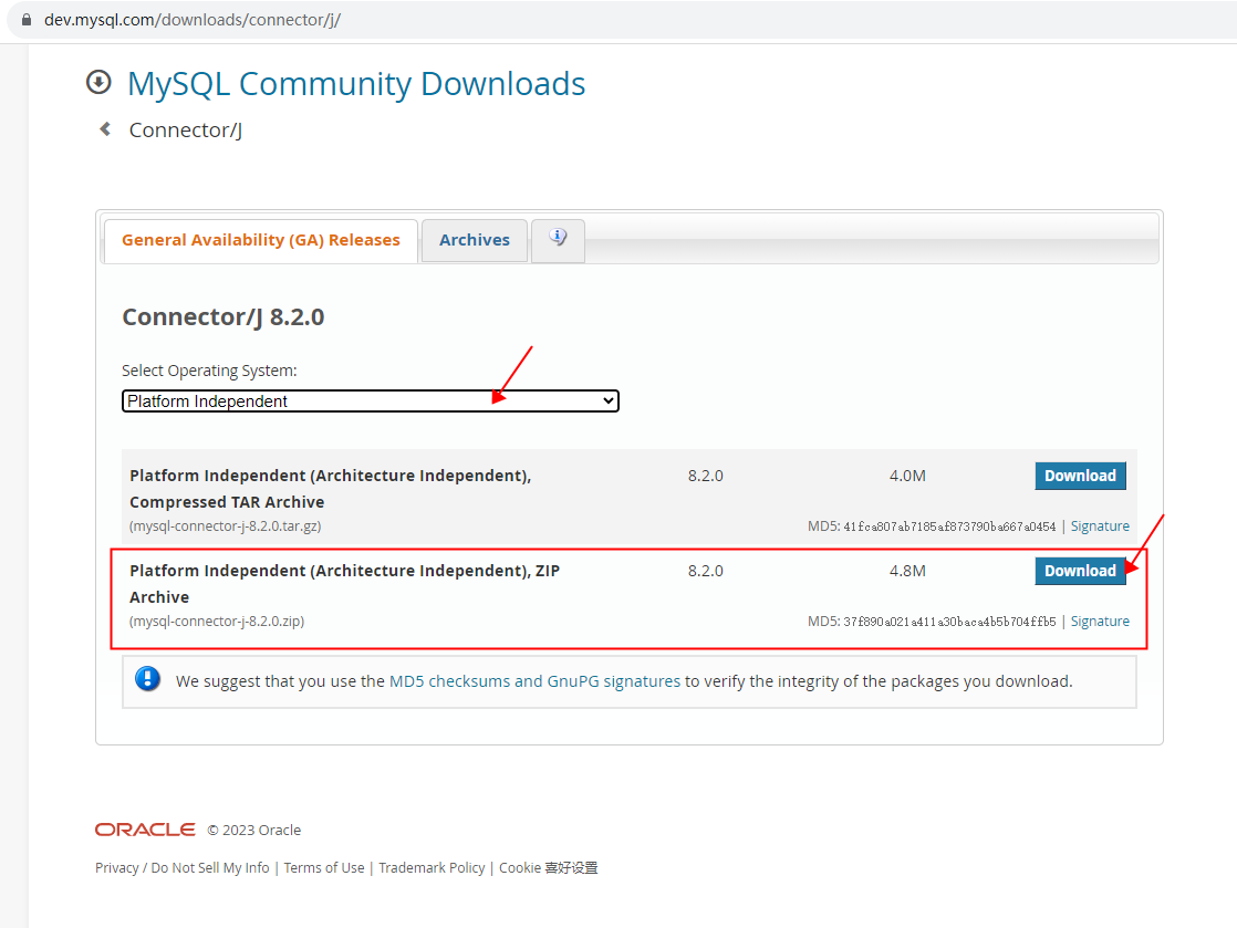 驱动是JDBC接口的实现类,这些实现类是各大数据库厂家自己实现的,所以这些实现类的就需要去数据库厂商相关的网站上下载了。通常这些实现类被全部放到一个xxx.jar包中。下面演示一下mysql的驱动如何下载【下载mysql的驱动jar包】: 打开页面:https://dev.mysql.com/downloads/connector/j/